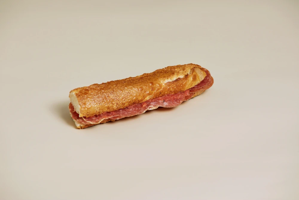 Baguette alargada de longaniza con una corteza crujiente y una miga suave y esponjosa.