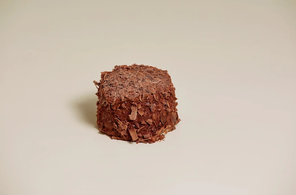 Merengue, ganache de chocolate y virutas de chocolate 70%.