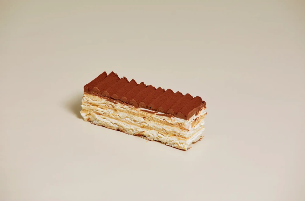 Plancha de almendra, muselina de praliné con toque de limón y cacao.