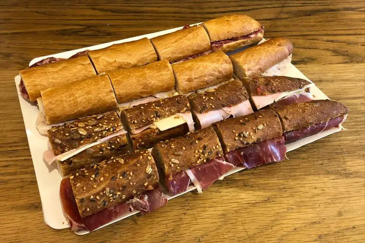 Bandeja de bocadillos con embutido y panes variados.