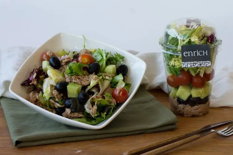 Ensalada con atún: atún (23%), aceitunas negras, pepino, tomate cherry y mezclum.