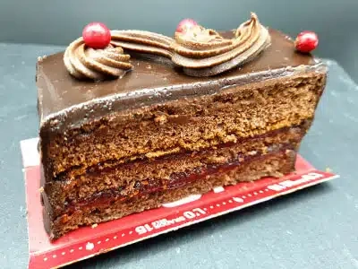 Bizcocho de chocolate, mermelada de frambuesa y baño de chocolate.